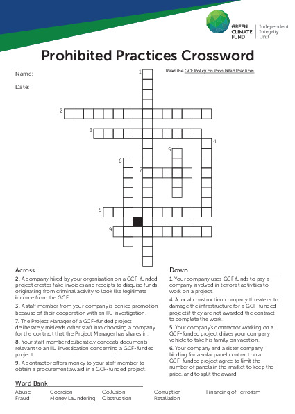 This crossword is designed as a game to help increase understanding of the GCF Prohibited Practices.