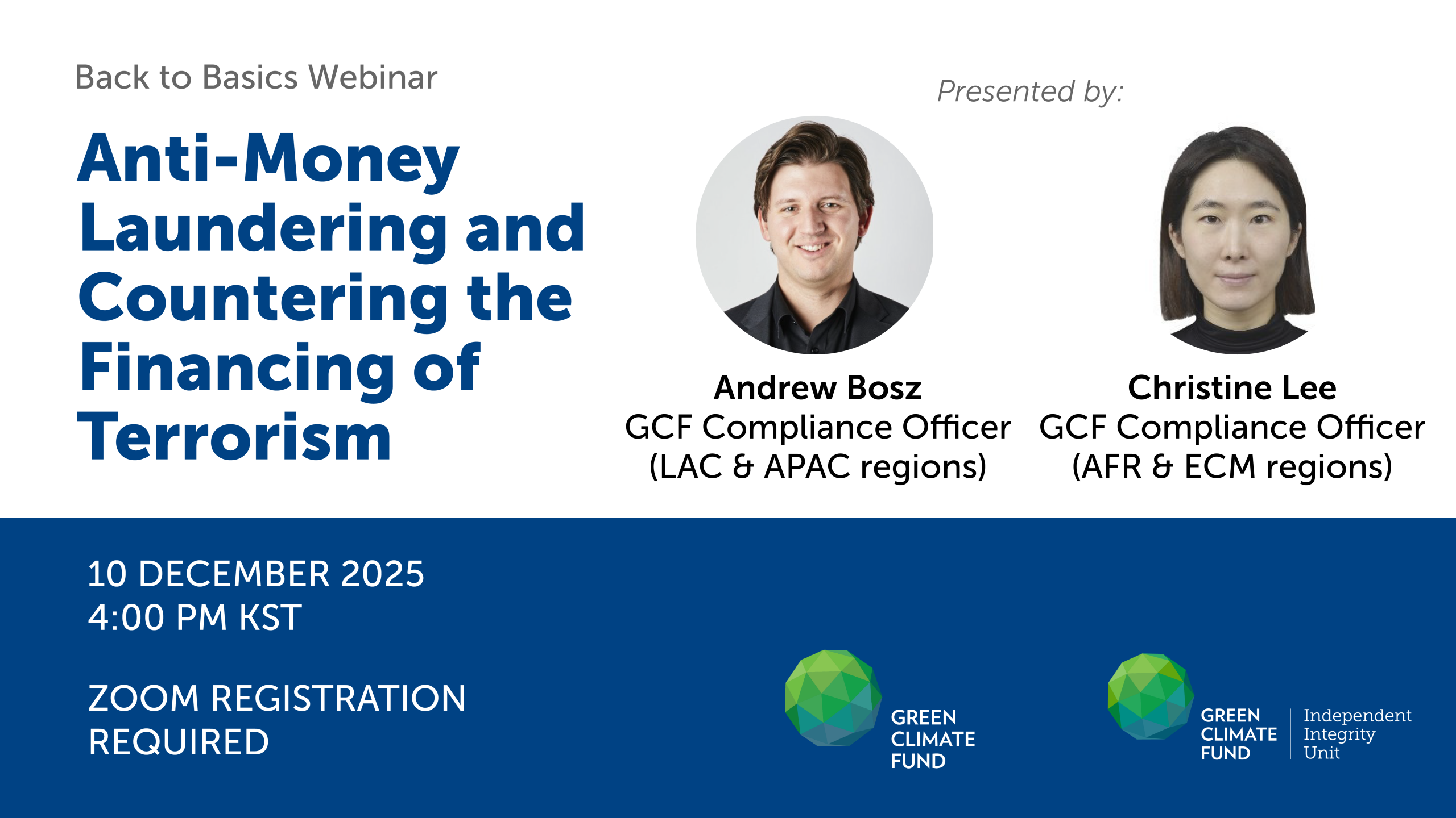 The webinar will last approximately one hour and feature a presentation by two members of the GCF Department of Risk Management and Compliance’s Regional Compliance Officers Andrew Bosz (DLAC & DAPAC regions) and Christine Lee (DAFR & DECM regions). The webinar will be recorded and shared with all registered participants. It will take place on Wednesday, December 10, from 16:00 - 17:00 Korean Standard Time.