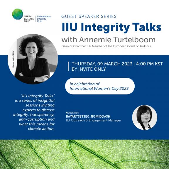 In celebration of International Women's Day, the Independent Integrity Unit (IIU) invites you to a virtual session to bring women's leadership experiences in the accountability space with the guest speaker event, "IIU Integrity Talks with Annemie Turtelboom."