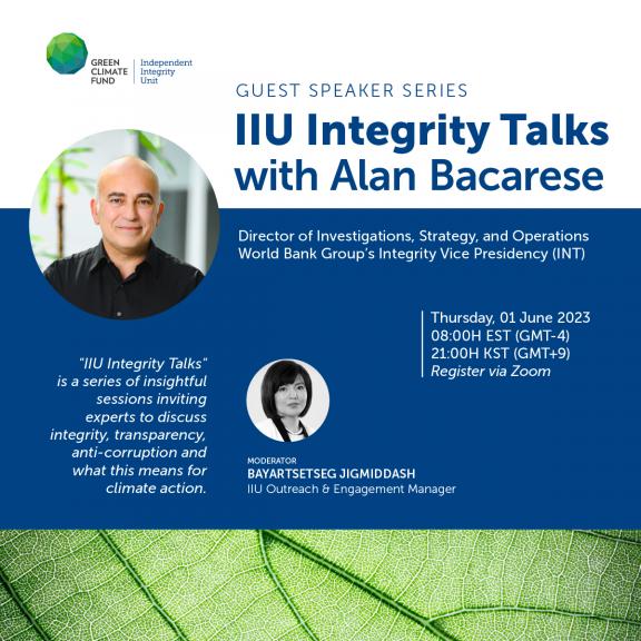 The Independent Integrity Unit (IIU) invites you to the next session in our signature webinar series Integrity Talks, which are events that discuss integrity, transparency and anti-corruption issues and their impact on various aspects of climate action. For this session, we are thrilled to be joined by Alan Bacarese, the Director of Investigations, Strategy, and Operations for the World Bank Group’s Integrity Vice Presidency (INT).