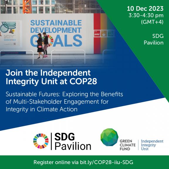 The Independent Integrity Unit will be hosting a side event at COP28 at the SDG Pavilion titled "Sustainable Futures: Exploring the Benefits of Multi-Stakeholder Engagement for Integrity in Climate Action".
