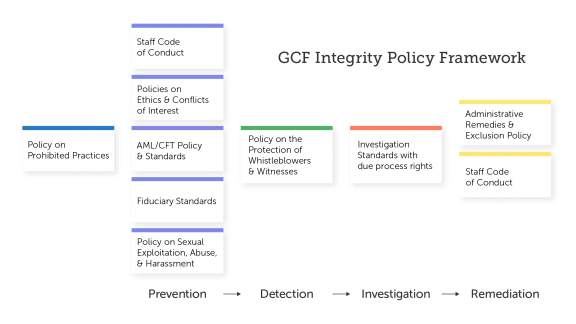 Adopted by decision B.22/19. Establishes the specific conduct and activities which are prohibited, the obligations of Covered Individuals and Counterparties to uphold the highest standards of integrity, and the actions which the GCF may take when prohibited practices are alleged to have occurred in Fund-related Activities.
